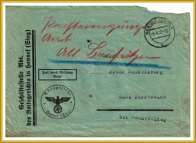 1937, 3. April. Offizieller Brief vom Amtsgericht Hennef an Herrn Heckelsberg in Haus Dürresbach bei Hennef. Der Brief ist zwar nicht mit einem Freistempler-Aufdruck, hat aber einen eingedruckten Vermerk: „Frei durch Ablösung Reich!“.