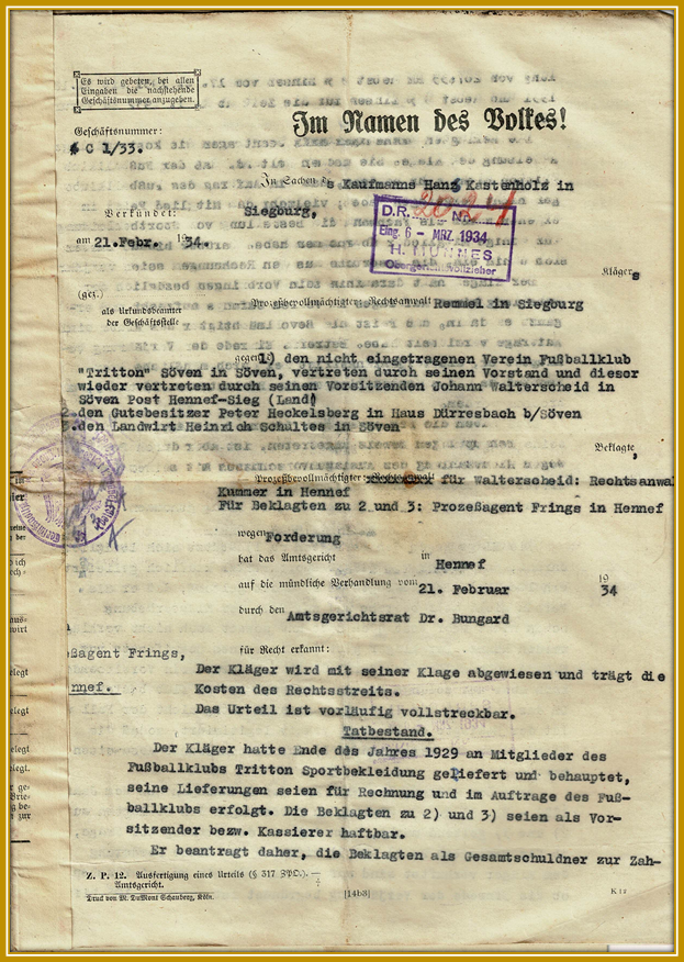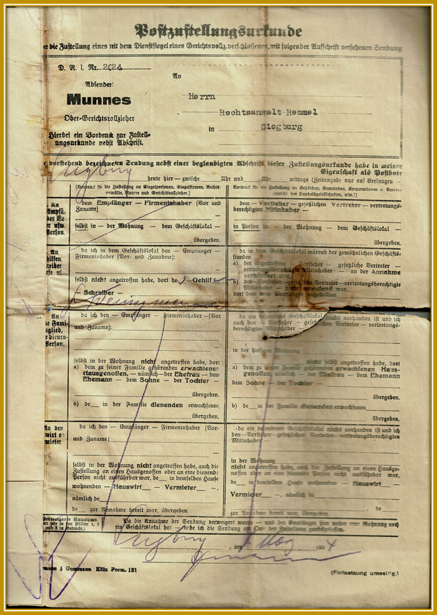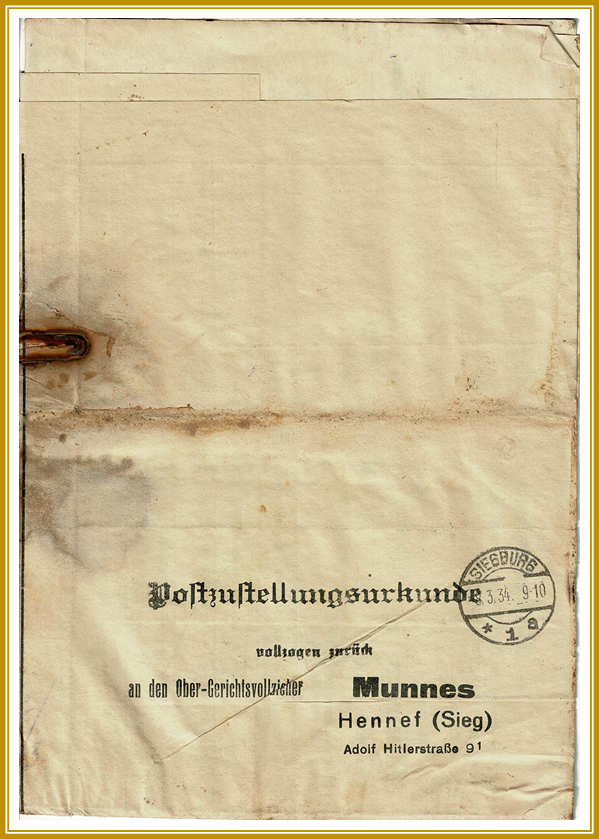 1934, 8.3. Postzustellungsurkunde gelaufen von Siegburg (Rechtsanwalt Hemmel) zurück nach Hennef (Ober-Gerichtsvollzieher Munnes). Auch diese Post lief über die sogenannte „Gebührenablösung“